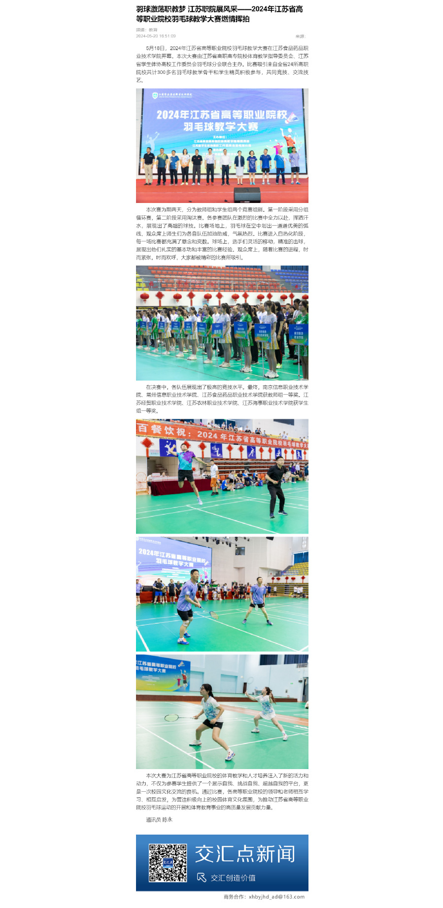 本次大赛为江苏省高等职业院校的体育教学和人才培养注入了新的活力和动力,不仅为参赛学生提供了一个展示自我、挑战自我、超越自我的平台,更是一次校园文化交流的良机。通过比赛,各高等职业院校的领导和老师相互学习、相互启发,为营造积极向上的校园体育文化氛围,共同推动共同推动江苏省高等职业院校羽毛球运动的开展和体育教育事业的高质量发展贡献力量。