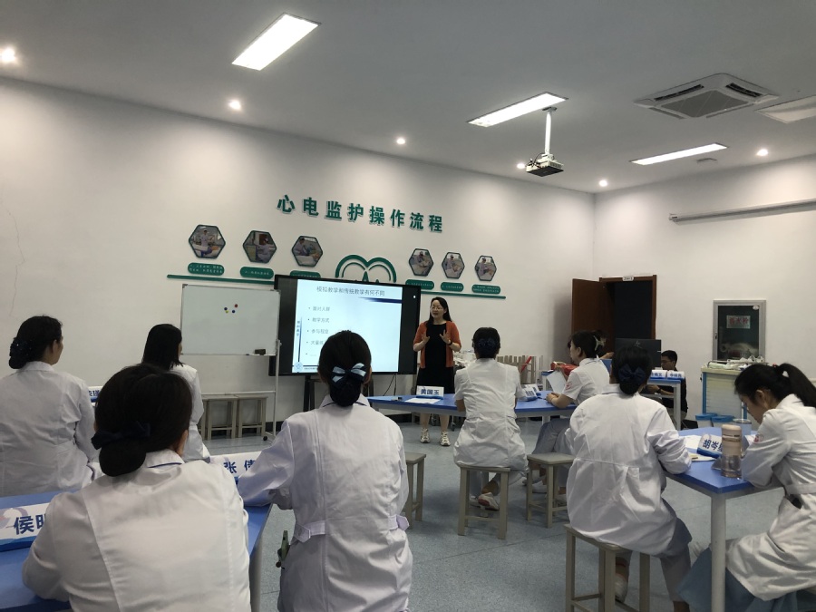 理论授课后,授课老师以2个小组准备的教学案例为基础,通过案例运行,带领老师们进行了护理模拟教学案例的完整运行。
