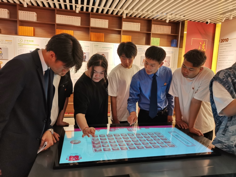在工作人员的带领下,大家先后参观了未检工作展示区、普法体验区、法治文化区以及宪法宣传教育馆。未检工作展示区结合一个个鲜活的案例,以案释法,为同学们上了一堂生动的法治课;普法体验区通过模拟法庭、禁毒教育区、网络安全教育区等模块,增强了学生的法治意识;在法治宣誓区,同学们以生命的名义庄严宣誓,做一名遵纪守法的合格公民;在宪法宣传教育馆,同学们明确了宪法赋予的权利与义务,加深了对全面依法治国的了解。参观结束后,大家穿上法袍、制服,担当“法官”“检察官”“辩护律师”“原告”“被告”等角色,在模拟法庭 “沉浸式”体验了一起“校园寻衅滋事”案件的庭审过程,亲身感受到了法治实践的魅力以及法律的神圣和庄严。