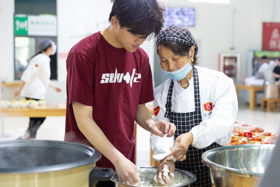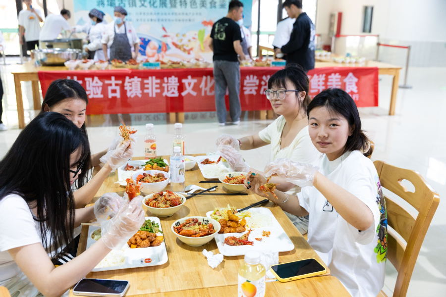 活动中,师生们通过展板“打卡”了洪泽湖大堤、三河闸水利工程、蒋坝古镇等洪泽地标,了解了江苏省非物质文化遗产——蒋坝酸汤鱼圆烹饪技艺,“沉浸式” 感受了洪泽魅力。在活动体验环节,同学们在老师的指导下体验制作了酸汤鱼圆,品尝了洪泽龙虾、三鲜鱼饼等特色佳肴。