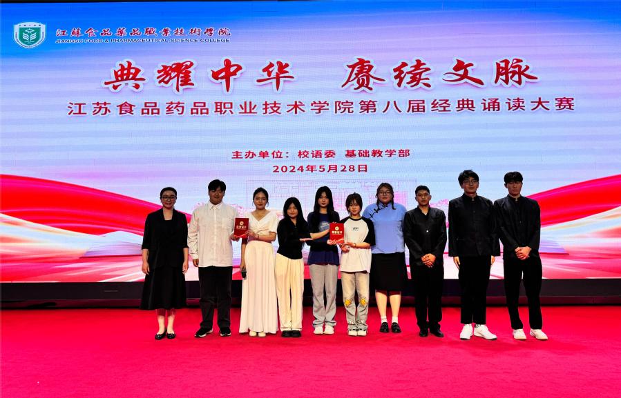 经过激烈角逐,数字经济学院胡媛媛、王艺诵读的《不朽》,制药工程学院杨鑫、陈磊诵读的《红船,从南湖起航》和马克思主义学院杜洪雷、刘宝玉、吴奕慧、李鑫诵读的《读淮安》获得教师组一等奖,药学院江天衣、食品学院贾翊帆诵读的《盛世中国》和制药工程学院付思琴、格桑旺久、蔡佳妤、李宜煊、李嘉鹏诵读的《周恩来》获学生组一等奖;