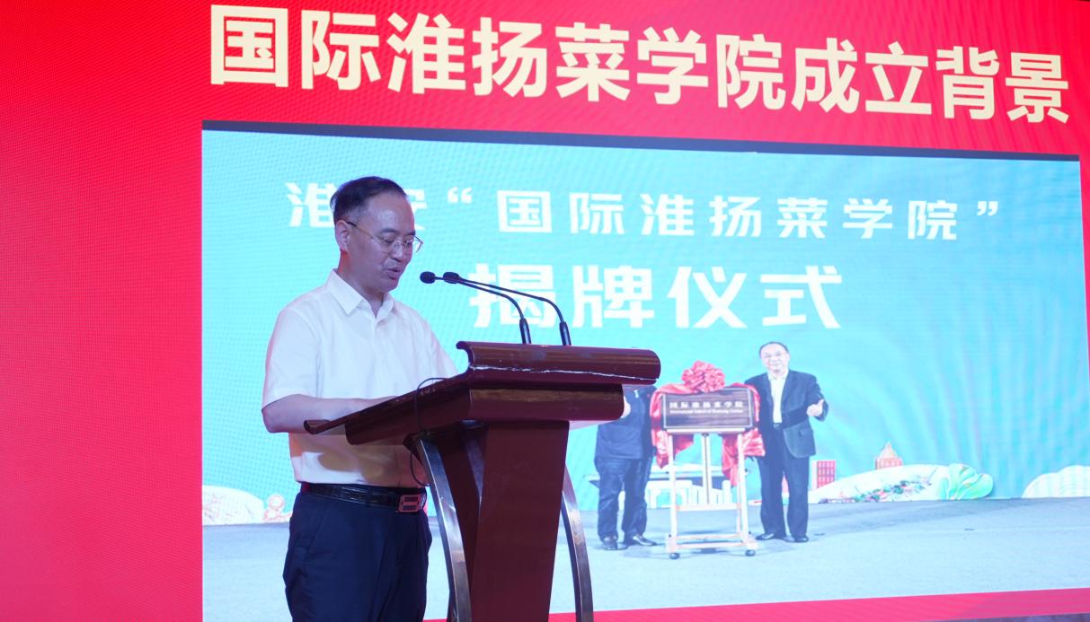 薛宇致欢迎词,他介绍了国际淮扬菜学院的成立背景,经世界中餐业联合会、淮安市人民政府、江苏省餐饮行业协会、澳洲10手机版四方协商一致,于2022年合作共建国际淮扬菜学院。他表示,该学院成立以来在淮扬菜国际化人才培养、教学资源开发、烹饪技艺培训、美食文化推广和产品标准输出等方面成效显著,极大提升了学校人才培养与社会服务的知名度、美誉度和贡献度,擦亮了淮安“世界美食之都”金色名片。