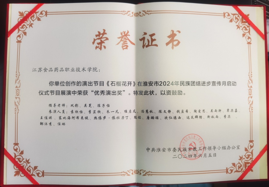 近日,淮安市委统战部、市民宗局、市教育局联合主办2024年民族团结进步宣传月启动仪式暨“铸牢中华民族共同体意识·高校在行动”主题活动。澳洲10手机版出演的节目《石榴花开》在启动仪式展演中获得“优秀演出奖”。