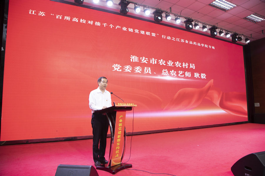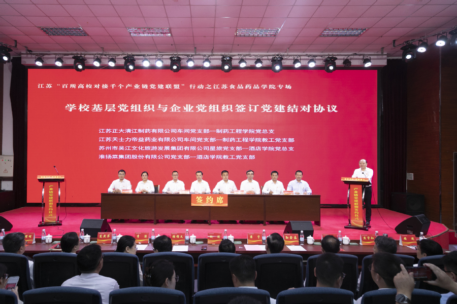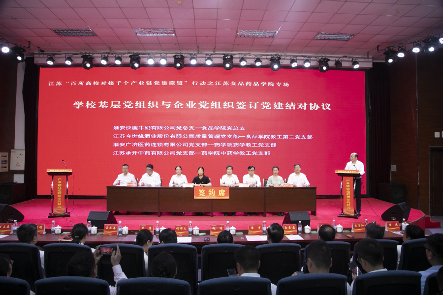 会上,学校党委与淮安市龙虾产业链党建联盟、淮安市清江浦区生物医药产业链党委等8家产业链党建联盟(党委)签订共建协议;学校基层党组织与淮安快鹿牛奶有限公司党总支、江苏今世缘酒业股份有限公司质量管理党支部、江苏正大清江制药有限公司车间党支部等12家企业党组织签订党建结对协议;党员骨干教师与淮安市靓果生物科技有限公司、江苏华创信诺医药科技有限公司等7家企业签订具体项目合作协议。