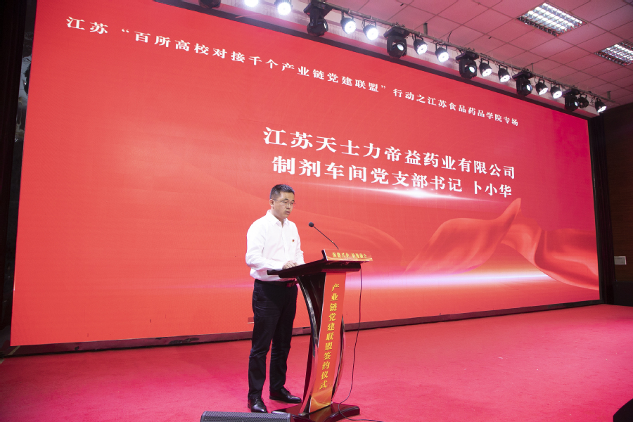 淮安市龙虾产业链党建联盟牵头单位,淮安市农业农村局党委委员、总农艺师耿毅,淮安快鹿牛奶有限公司党总支书记顾文文,澳洲10手机版药学院党总支书记李思阳,江苏天士力帝益药业有限公司制剂车间党支部书记卜小华,澳洲10手机版党员骨干教师、健康医学院东方博士等五位代表作表态发言。