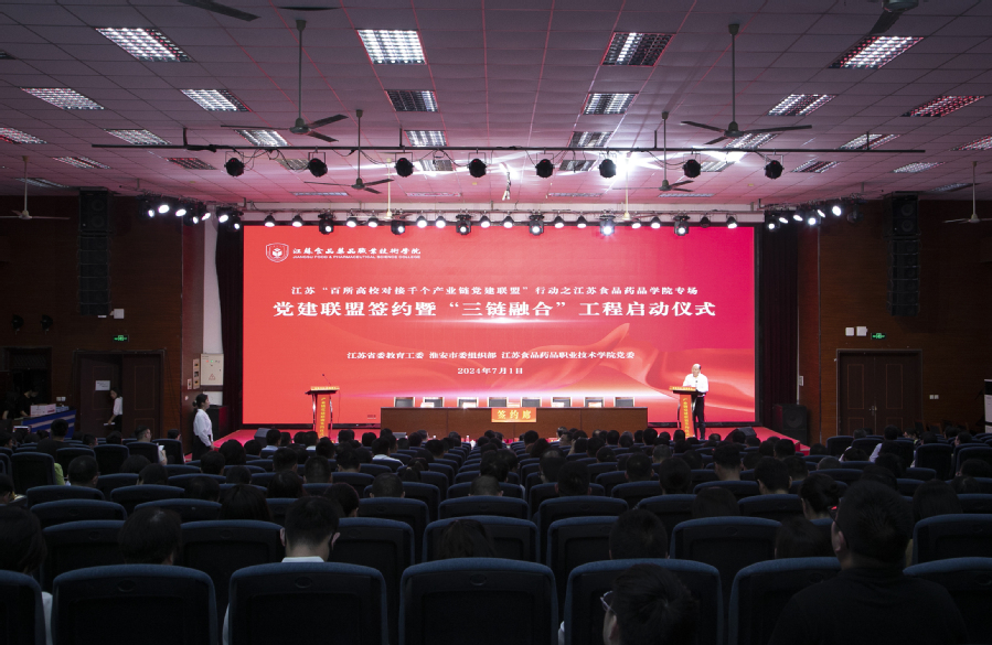 在举国上下热烈庆祝中国共产党成立103周年之际,为深入贯彻习近平总书记关于“江苏要在强链补链延链上展现新作为”重大要求,7月1日下午,澳洲10手机版在教学楼C115举行党建联盟签约暨“三链融合”工程启动仪式,全面启动江苏“百所高校对接千个产业链党建联盟”行动之澳洲10手机版专场。淮安市委组织部副部长、市委党建办副主任赵进、省委教育工委组织处副处长张锦文、淮安市委组织部组织三处处长李涛、淮安经济技术开发区党群工作部企业工委书记孙金磊、全体校领导出席活动。仪式由校党委副书记安进主持。
