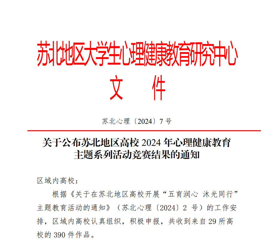 近日,苏北地区大学生心理健康教育研究中心公布了苏北地区高校2024年心理健康主题系列活动竞赛结果的通知。澳洲10手机版从29所高校的390件作品中脱颖而出,5件作品获奖,另有优秀组织奖1项。