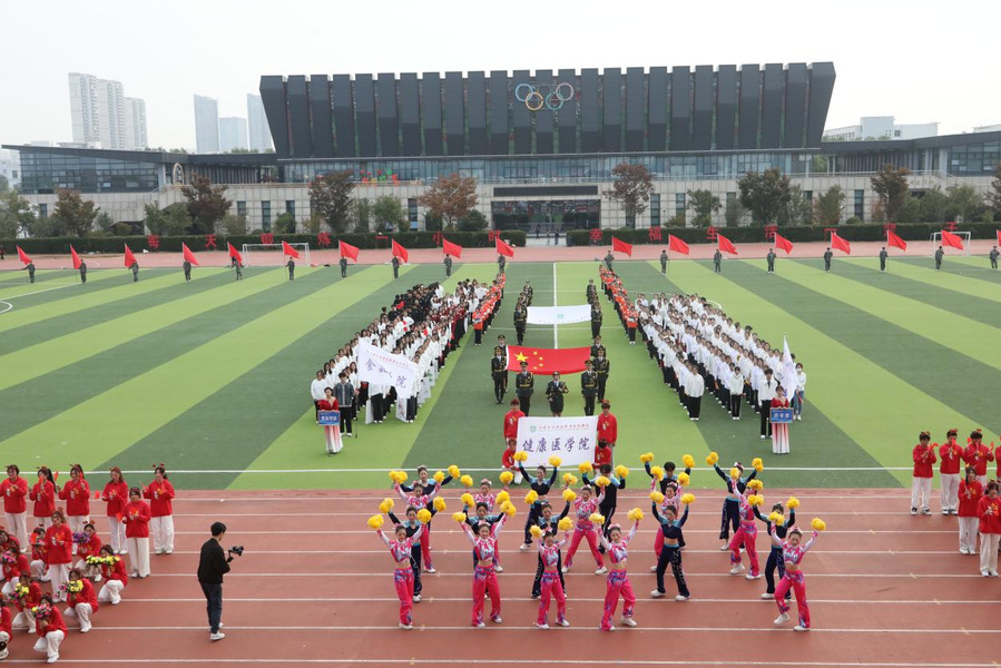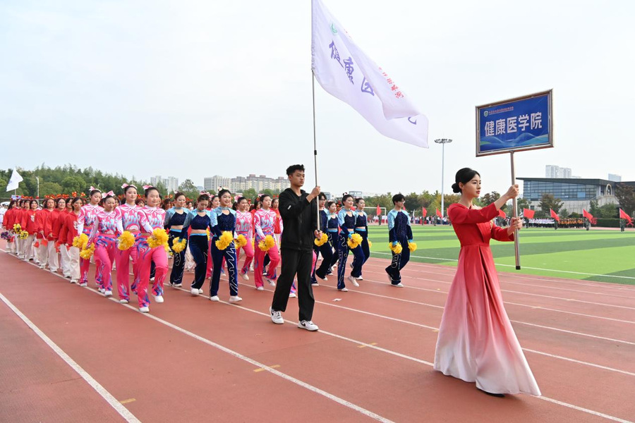 健康医学院代表队笑容灿烂,热情洋溢,口号嘹亮,激情燃烧。他们用精彩生动地花球表演为赛场带来无限生机与活力。