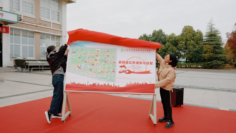 此次活动现场两个展板极为醒目,一个是铸牢中华民族共同体意识主题图,另一个是设计的校园红色迷你马拉松的路线图,在校园地图中标注了13个重要的地图打卡点,活动的总路程约为4公里。周耀明部长、学工处处长李金霞、食品学院副书记刘晓苏、食品药品研究院副院长马宇春分别为主题展板和路线图揭幕。