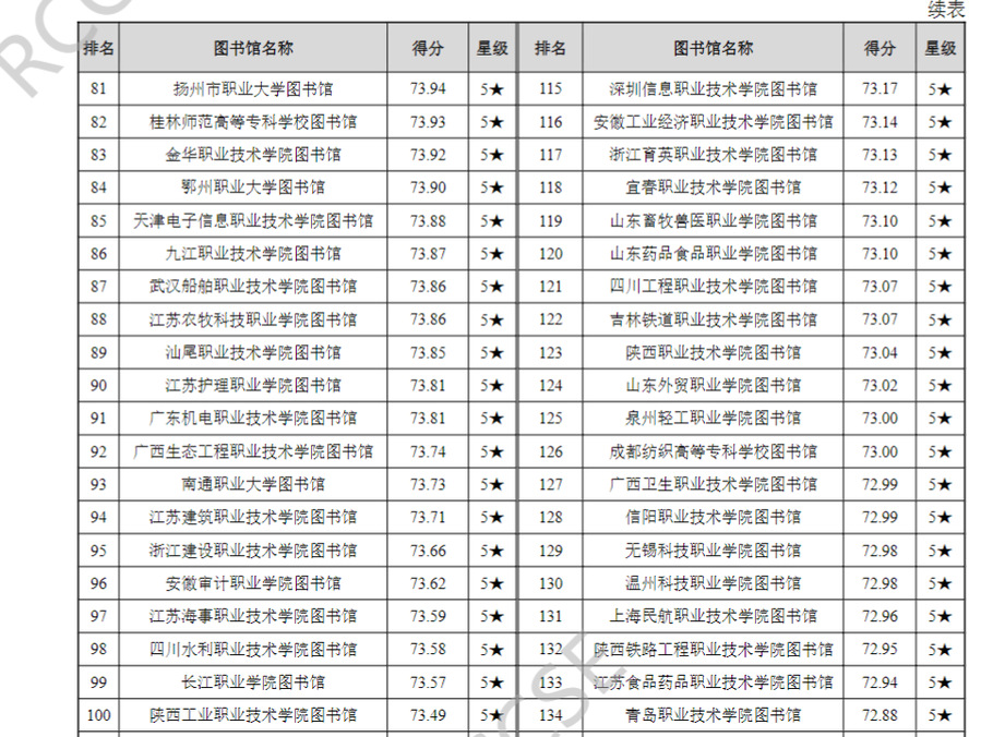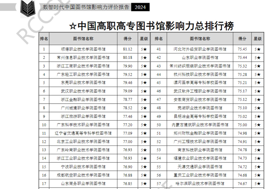 近日,武汉大学中国科学评价研究中心、中国科学与科技政策研究会科学计量学与信息计量学专业委员会联合发布了《数智时代中国图书馆影响力评价报告(2024)》,报告从基础实力、网站影响力、新媒体影响力、社会影响力、学术影响力等5个方面对全国2820所普通高校,其中1545所高职(专科)院校图书馆进行评价。澳洲10手机版图书馆在中国高职高专图书馆影响力总排行榜中列133名,得分72.94分,获评5星图书馆,在江苏省内高职高专排序第16位。