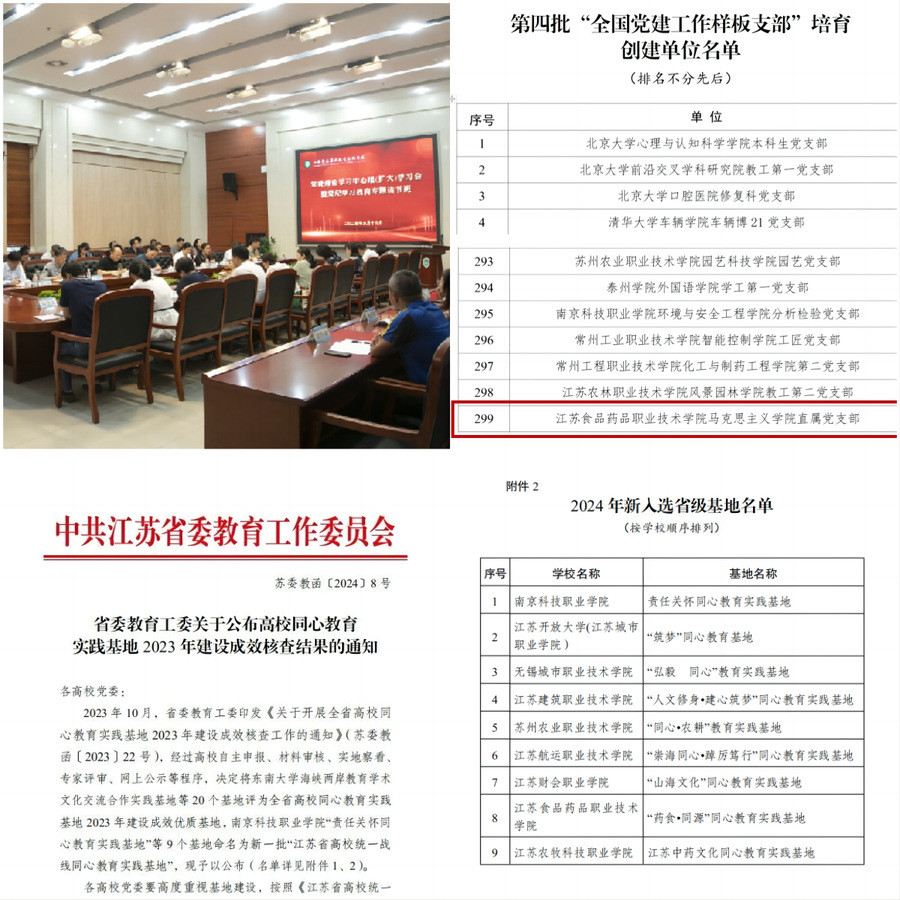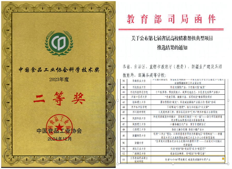 荣获中国食品工业协会科学技术奖二等奖,学校实现历史突破。获评教育部省属高校精准帮扶典型项目1项,为全省唯一获此殊荣高职院校。获批国家自然科学基金1项,省级以上自然科学基金、教育科学规划课题7项。立项省发改委“工程研究中心”1个,江苏省大型科研仪器开放共享绩效评价良好,全省高职院校第1,科研与社会服务竞争力位列全国高职第44名。