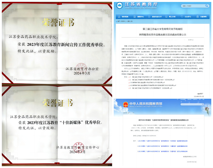学校4项“思政精品”项目推荐至教育部参加评选,推荐数量全省高职院校第一。入选教育部“礼敬中华优秀传统文化”宣传教育活动、省级思政精品、省“一节一推选”、省“技能成才、强国有我”优秀成果展示等省级以上奖项12个。学校获评江苏省新闻宣传工作优秀单位和“十佳新媒体”优秀单位,学校发展成果全年在人民日报等国家级媒体刊发17篇、省级媒体刊发112篇。