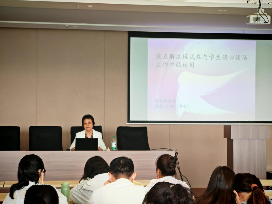 为贯彻落实教育部等十七部门全面加强和改进新时代学生心理健康工作专项行动计划(2023—2025年)》,深入推进“润心”行动,切实提升辅导员、班主任谈心谈话能力,5月20日,学生工作处心理发展服务中心在图书馆5楼举办“焦点解决模式在学生谈心谈话工作中的运用”专题培训,专职心理教师、辅导员、班主任共计102人参与学习。本次培训由江苏理工学院张冬梅教授主讲,心理发展服务中心主任沈方子主持。