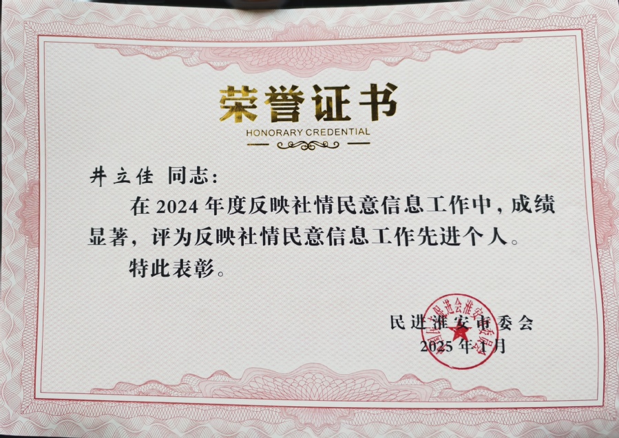 在反映社情民意信息工作方面,澳洲10手机版民进党员迟恒、井立佳两位同志表现突出,被民进淮安市委会评为“2024年度反映社情民意信息工作先进个人”。