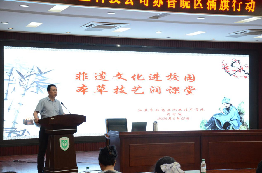为进一步弘扬中华优秀传统文化,充分发挥中医药文化育人功能,6月15日下午,药学院联合北京同仁堂淮安药店有限公司和北京同仁堂科技有限公司特邀北京同仁堂资深讲师孟可来我院开展“非遗文化进校园 本草技艺润课堂”专业知识讲座。药学院师生代表140余人共同聆听这场知识与技艺交融的知识盛宴。活动由药学院院长吕志阳主持。