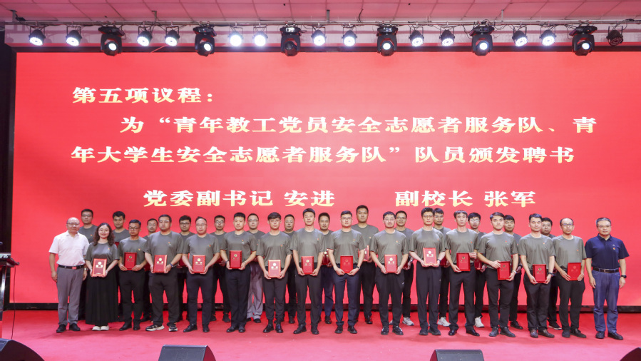 安进副书记宣读了《关于成立第一届青年教工党员安全志愿者服务队的决定》和《关于成立第一届青年大学生安全志愿者服务队的决定》及名单,40名青年教工党员、19名青年大学生经过个人申请、组织推荐、部门审核等程序,光荣加入了学校安全志愿者服务队。仪式上发布了《青年教工党员安全志愿者服务队管理办法》、《青年大学生安全志愿者服务队管理办法》。
