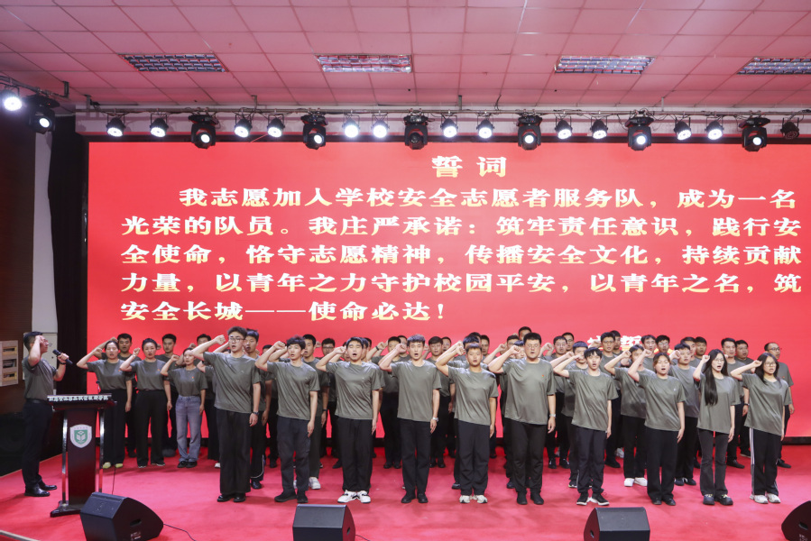 “我志愿加入学校安全志愿者服务队,成为一名光荣的队员。我庄严承诺:筑牢责任意识,践行安全使命……”在队长的领誓下,全体队员右手握拳,以铿锵有力的誓言宣告:将以实际行动筑牢校园安全防线。
