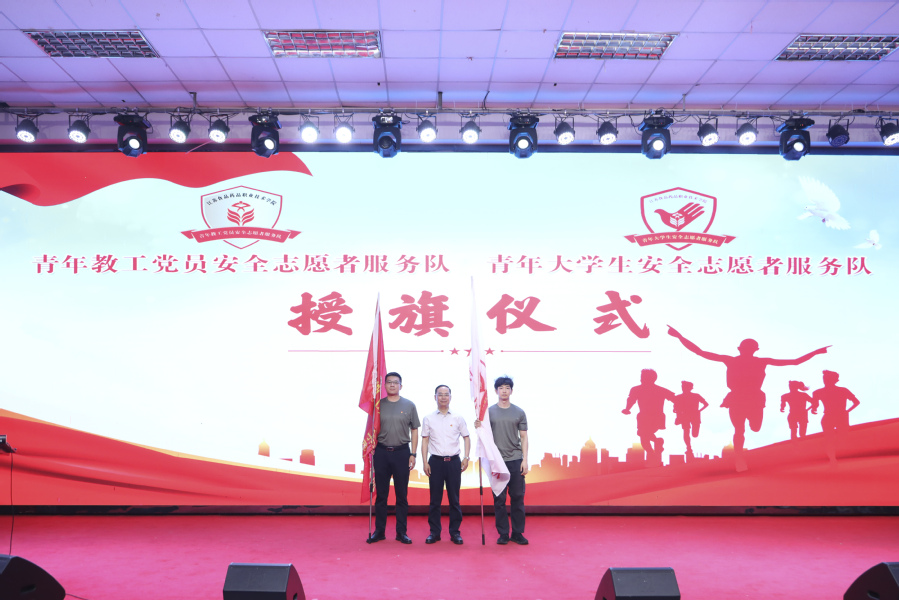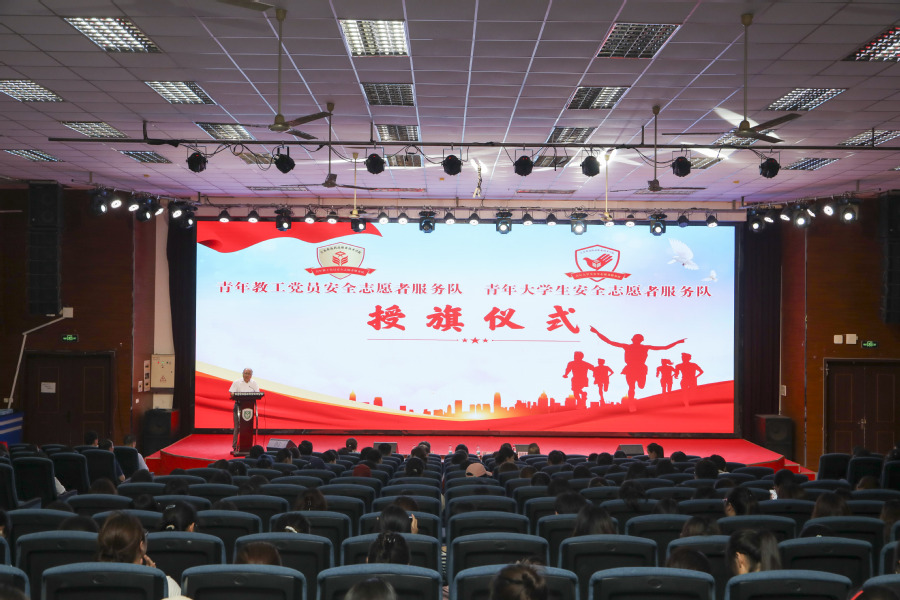 在全场热烈的掌声中,薛宇书记为两支服务队授予队旗,鲜红的队旗高高飘扬,象征着青年安全志愿者“守护校园、服务师生”的责任与担当。