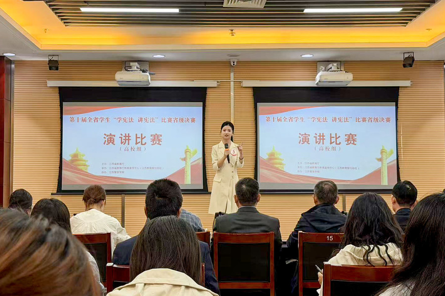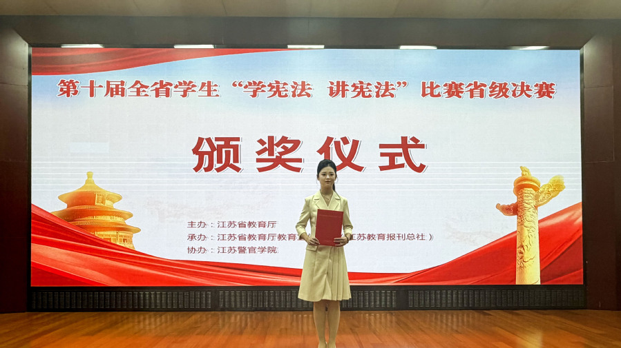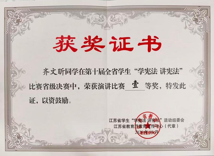 本次比赛由江苏省教育厅统一部署,决赛分为主题演讲与即兴演讲两个环节。在主题演讲环节,齐文昕同学以《以青春之名,赴宪法之约》为题,声情并茂、以思促讲,赢得了评委的一致好评;在即兴演讲环节,她沉着冷静、思路清晰,围绕《中华人民共和国民营经济促进法》中的法律实践以及社会影响力展开深入论述,逻辑严密、语言流畅,充分彰显了澳洲10手机版学子对宪法精神的深刻理解与出色的践行能力。