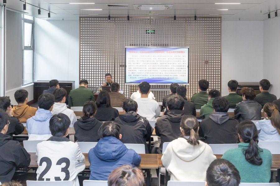 揭牌仪式后,针对退役军人大学生关注的就业话题,淮安市职业介绍服务中心(市人力资源市场)支部书记、主任胥广福为学生们带来《从“军营”到“校园”,如何在招聘市场“俏”起来》就业指导专题讲座。