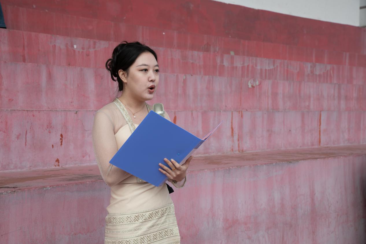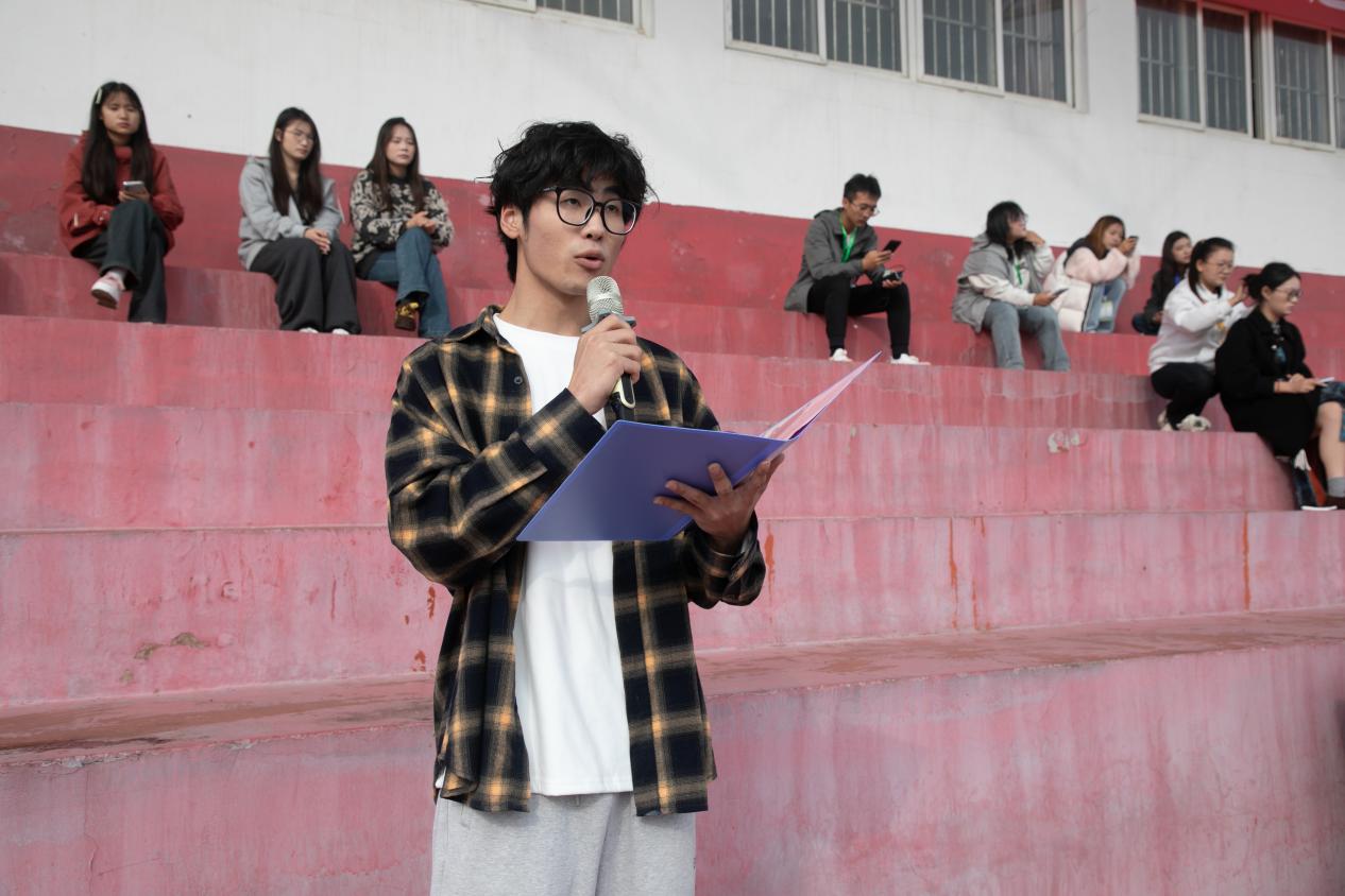 随后,何星宇老师代表全体裁判员宣誓,药学院药学244班张耀天同学代表全体运动员宣誓,来自缅甸国际电商241班的蒲嘉欣代表留学生进行发言。