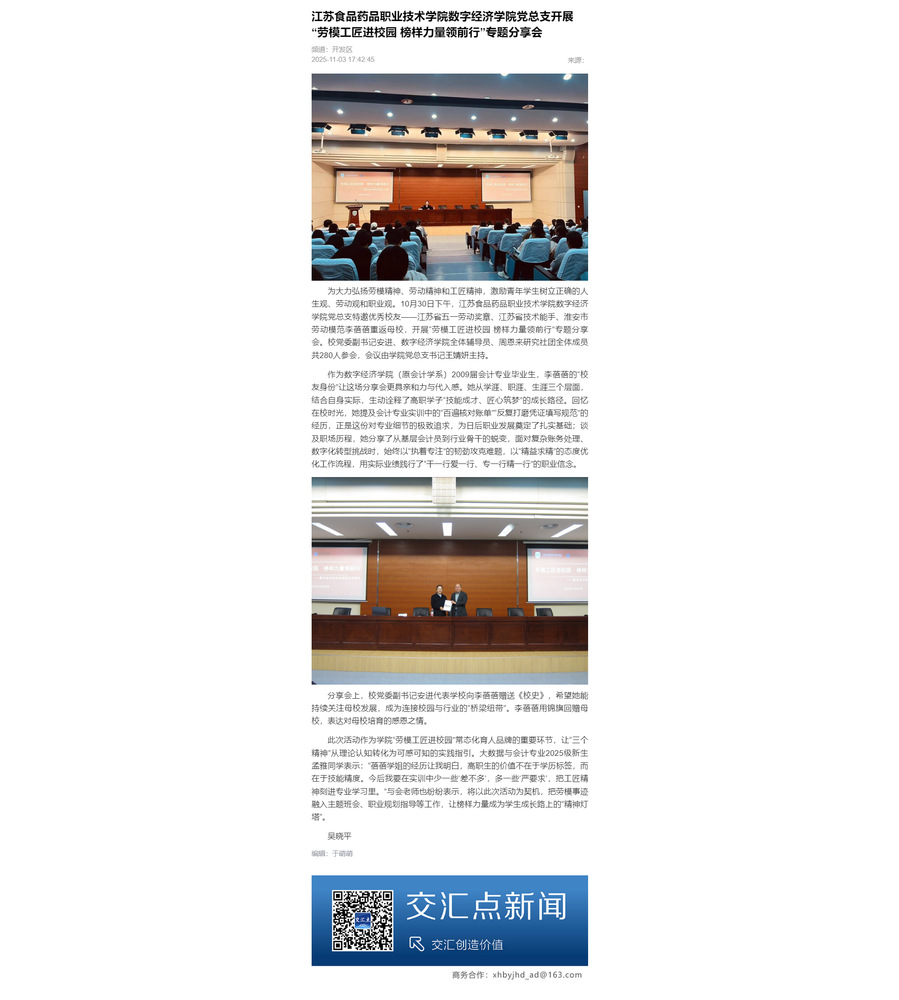 此次活动作为学院“劳模工匠进校园”常态化育人品牌的重要环节,让“三个精神”从理论认知转化为可感可知的实践指引。大数据与会计专业2025级新生孟雅同学表示:“蓓蓓学姐的经历让我明白,高职生的价值不在于学历标签,而在于技能精度。今后我要在实训中少一些‘差不多’,多一些‘严要求’,把工匠精神刻进专业学习里。”与会老师也纷纷表示,将以此次活动为契机,把劳模事迹融入主题班会、职业规划指导等工作,让榜样力量成为学生成长路上的“精神灯塔”。
