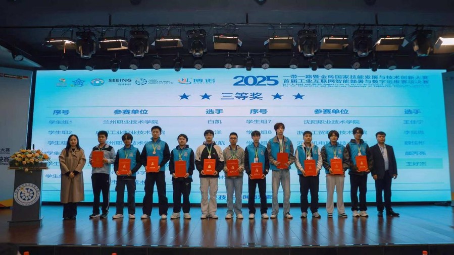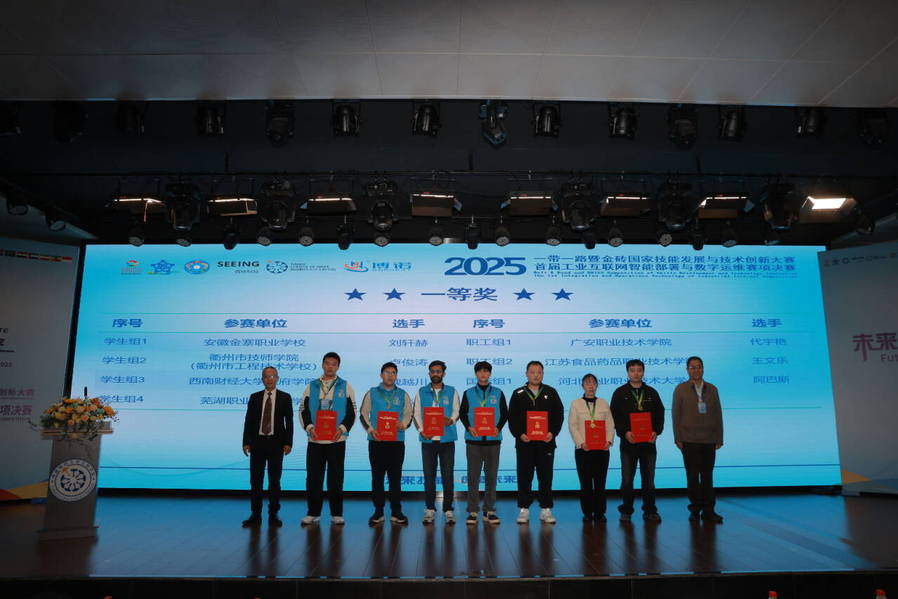 11月10日,2025“一带一路”暨金砖国家技能发展与技术创新大赛首届工业互联网智能部署与数字运维赛项决赛在四川绵阳西南财经大学天府学院圆满落幕。澳洲10手机版职工组选手王文乐凭借精准技术部署与高效问题处置能力,在理论考核与实操竞技中脱颖而出,斩获职工组一等奖,成功晋级2026年4-5月在北非摩洛哥卡萨布兰卡举办的国际总决赛,且学校获得了优秀组织奖;学生组选手吴嘉庆(指导教师王文乐)协同攻坚、沉着应对复杂任务,拿下学生组三等奖。