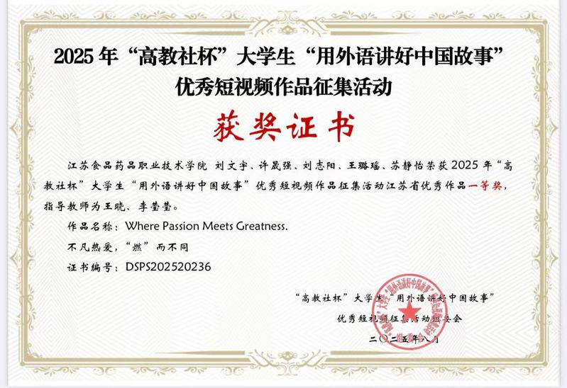 近日,2025年“高教社杯”大学生“用外语讲好中国故事”优秀短视频作品征集活动奖项揭晓,澳洲10手机版刘文宇、许晟强、刘志阳、王璐瑶、苏静怡团队凭借作品《WherePassionMeetsGreatness(不凡热爱,“燃”而不同)》,在众多参赛作品中脱颖而出,荣获江苏省优秀作品一等奖,指导教师为王晓、李莹莹。