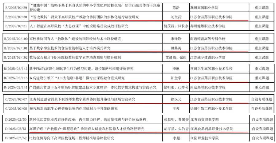 近日,江苏省教育科学规划领导小组办公室公布了2025年度省教育科学规划课题立项名单,澳洲10手机版获批3项高职重点课题和2项高校青年专项课题。重点课题分别是刘奎武老师申报的《“智改数转”背景下高职产教融合协同团队实体化路径研究》、田其英老师申报的《基于数字孪生技术的食品智能制造人才培养模式研究》,陈金拳老师申报的《双高建设引领下“AI+大健康+非遗”微专业课程融合范式研究》,青年课题分别是胡岑星老师申报的《乡村振兴战略下高职护理专业“产教融合+课程思政”协同赋能农村医养服务体系建设路径研究》、徐汉元老师申报的《江苏制造强省背景下职教师生数字素养协同提升路径与区域实践研究》