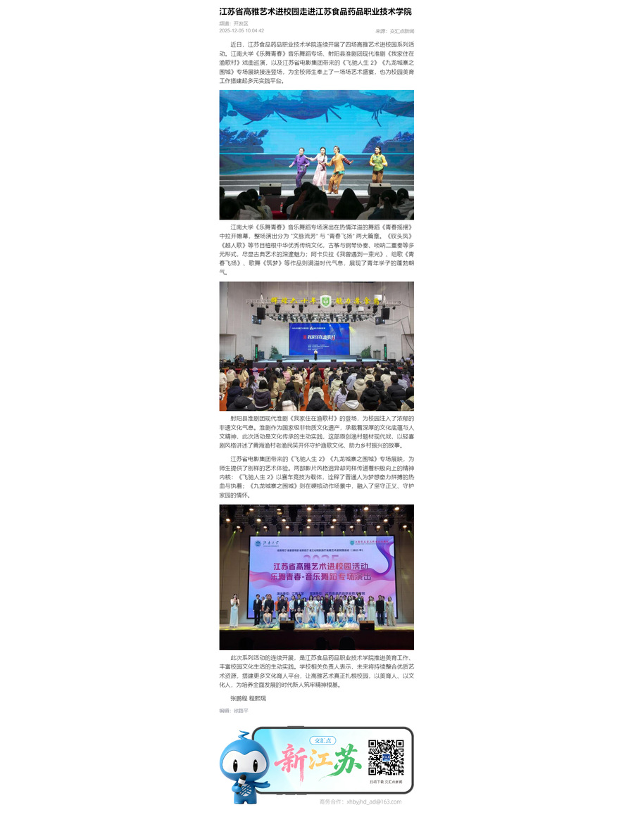 近日,澳洲10手机版连续开展了四场高雅艺术进校园系列活动。江南大学《乐舞青春》音乐舞蹈专场、射阳县淮剧团现代淮剧《我家住在渔歌村》戏曲巡演,以及江苏省电影集团带来的《飞驰人生2》《九龙城寨之围城》专场展映接连登场,为全校师生奉上了一场场艺术盛宴,也为校园美育工作搭建起多元实践平台。